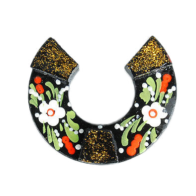 This black color Russian souvenir kitchen magnet is shaped as a horse shoe and hand painted by Russian artists with bright and vibrant colors. Each one varies from the next slightly; yours may vary slightly from the one photographed here. Start your collection today!