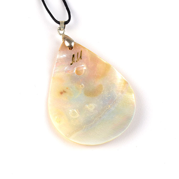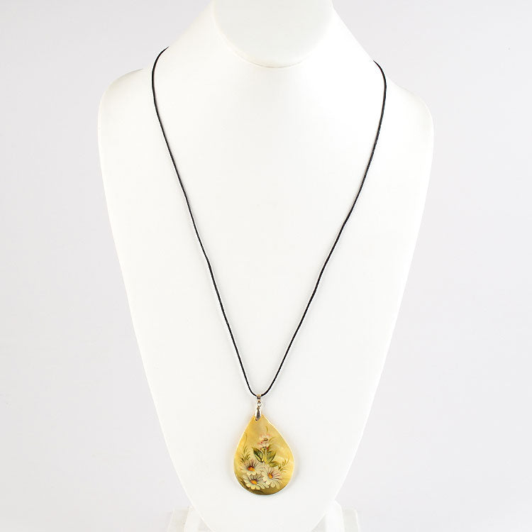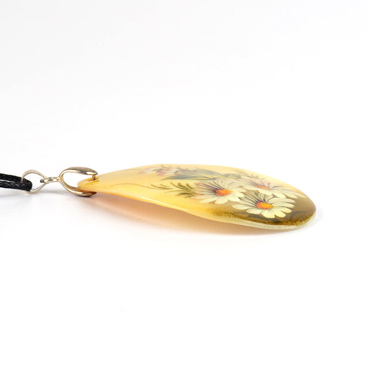 This mother-of-pearl necklace from Russia features a miniature painting of daisies done in Zhostovo style by a skilled artisan who initialed the back. The teardrop-shaped mother-of-pearl gemstone is Approximately 2" long and about 1 1/2" wide. It hangs from a simple, 30" black cord with a simple knot, making it easy to adjust the length of your necklace if you wish to do so.