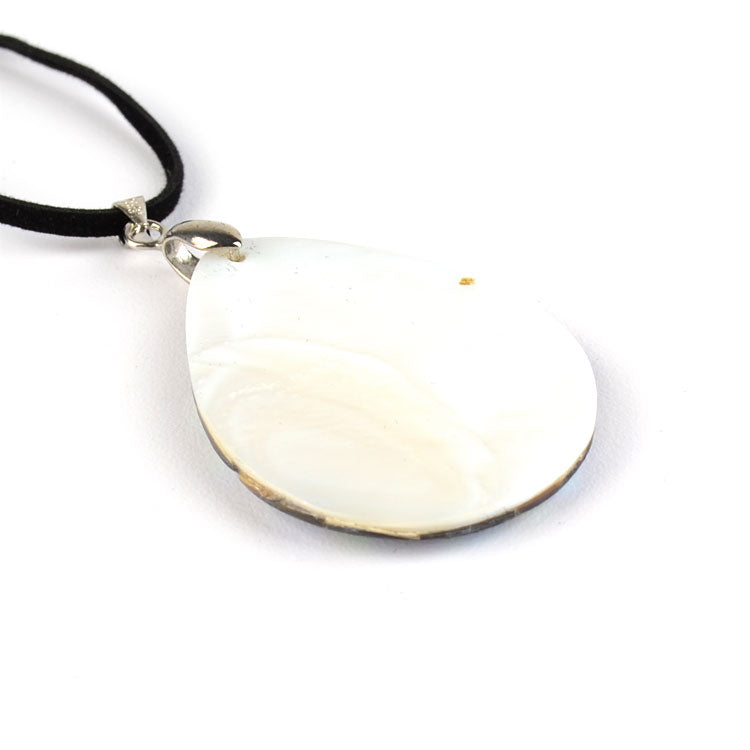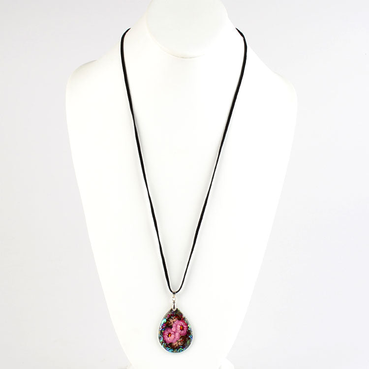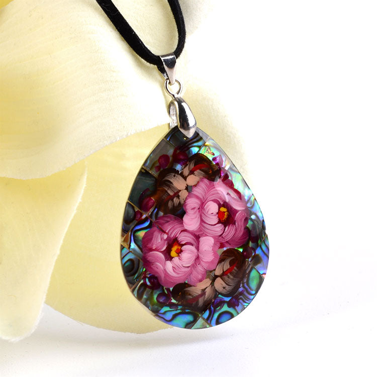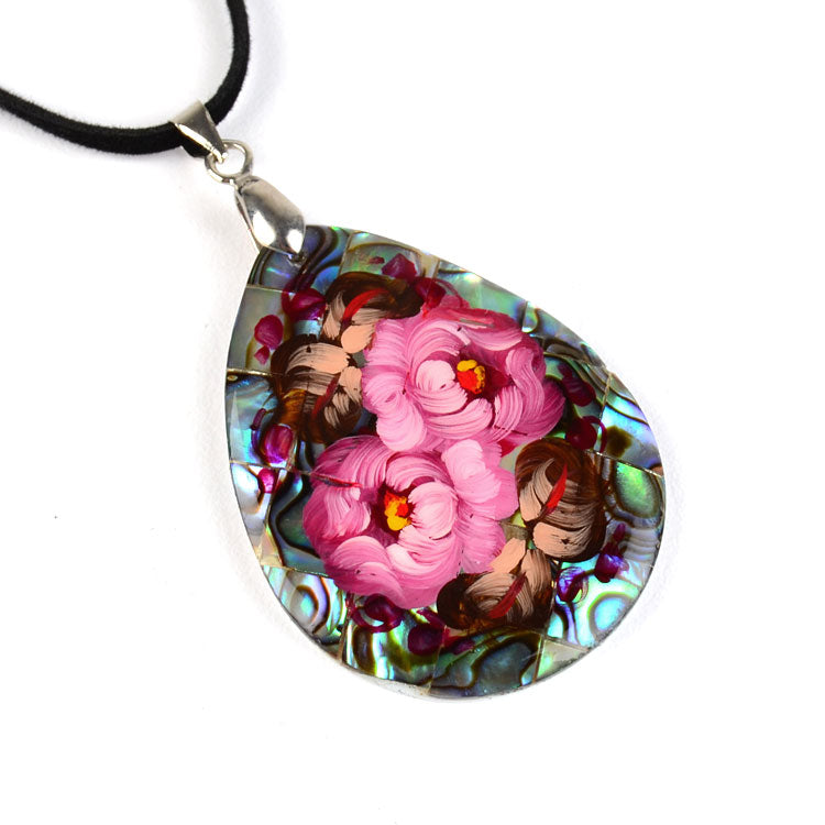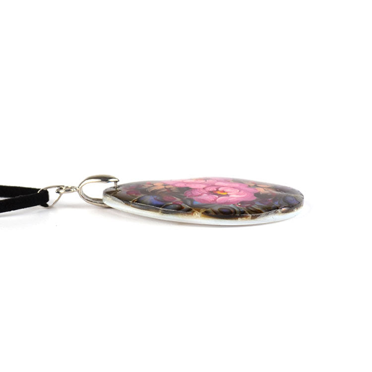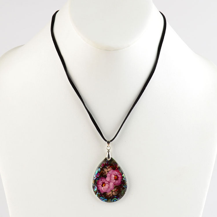 Zhostovo painting on abalone shell pendant necklace. There's something special about wearing a Russian artisan's hand-painted artwork around your neck! The teardrop-shaped abalone shell stone is Approximately 1 1/2" long and about 1 1/4" wide. It hangs from a soft, velvety, 36" black cord that contains a simple knot, making it fairly easy to adjust the length of your necklace if you wish to do so.
