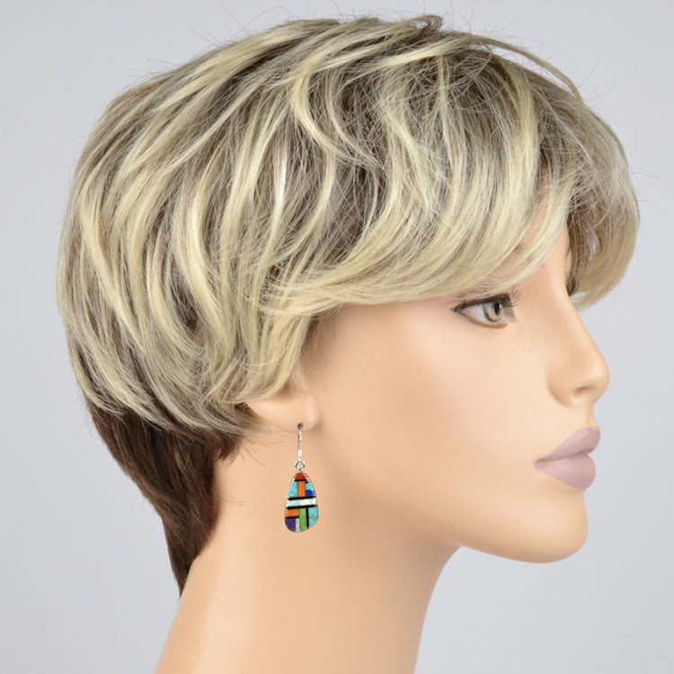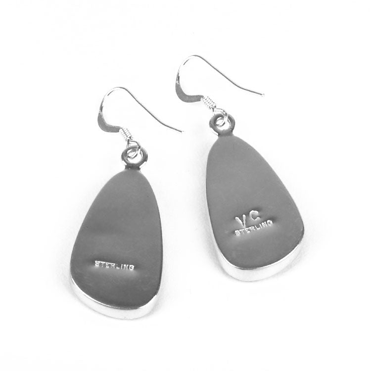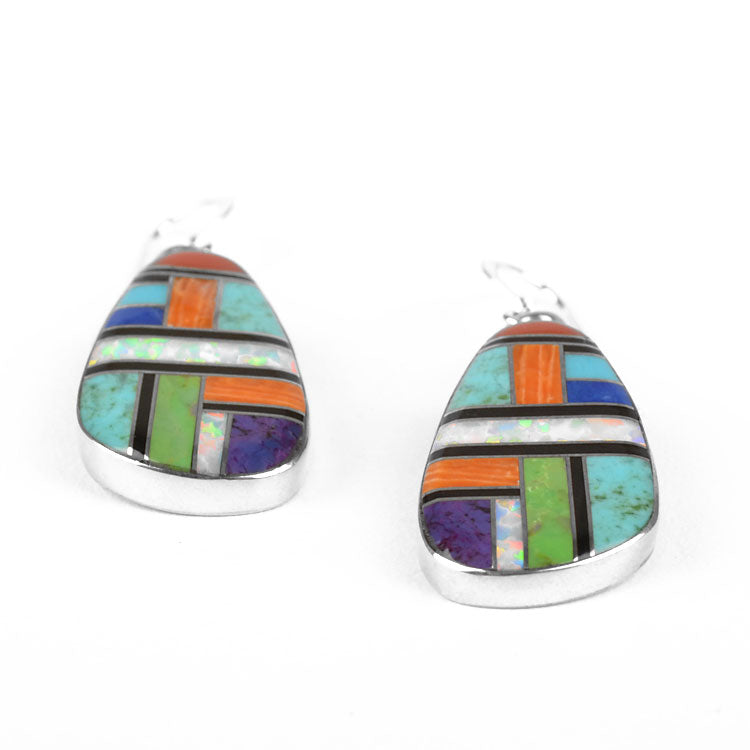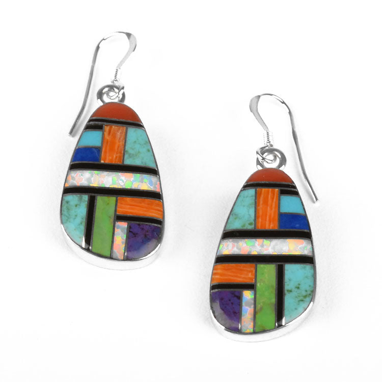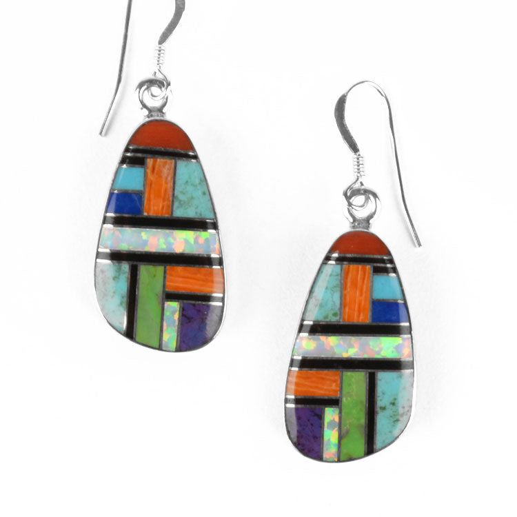 These mosaic Zuni inlay earrings look great with many outfits. A variety of colored gemstones (turquoise, opal, spiny oyster, and more) inlaid into sterling silver make up these 1 1/2" long earrings. The uniquely shaped drop is about 1" long. Simple hooks for easy on/off.