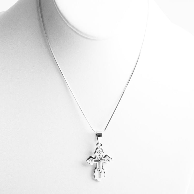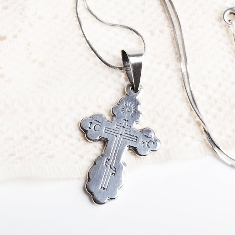 This three-bar eastern Russian Orthodox cross is made with highly polished sterling .925 silver. The letters are IC and xC, the name of Jesus Christ in Latin (Iesus xristos). It measures about 1 3/4" x 7/8," what a beautiful way to wear your faith!