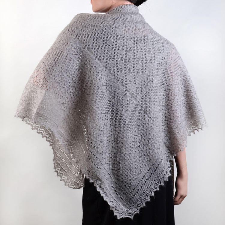 Do you want to look absolutely stunning while staying comfy and warm? This shawl is perfect for that. It is 51" x 51" in size, made of 50% down + 50% viscose (nylon), and is a medium to light gray color (that goes with everything). Imported from Russia and authentically made with Russain Orenburg goat's hair.
